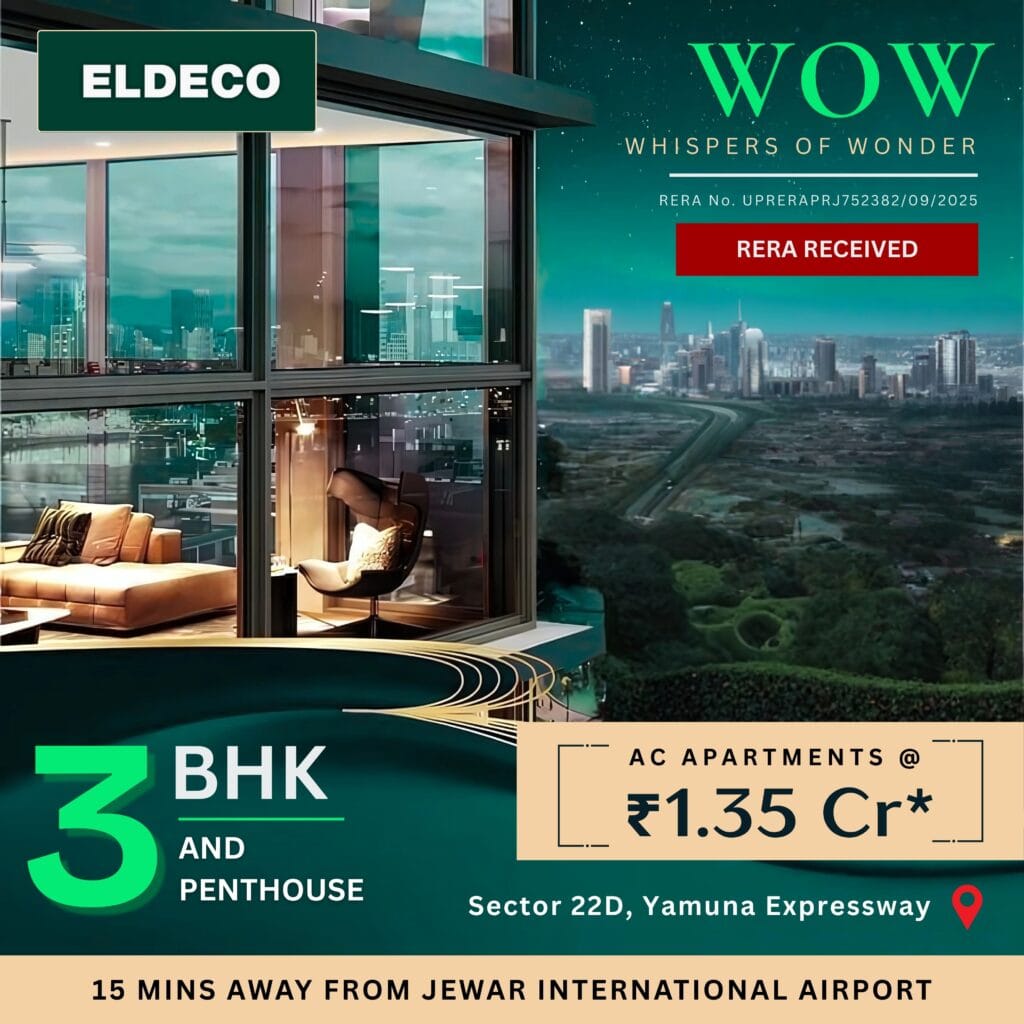 Eldeco WOW is a premium residential project by Eldeco Group, located in Sector 22D on the Yamuna Expressway, Greater Noida. Spread across 5 acres, the project is designed with a podium-based layout and offers three elegant towers rising up to 32 floors, comprising around 558 spacious units. The apartments are thoughtfully planned with 3-side open layouts that allow ample natural light and ventilation, and configurations include 3 BHK units ranging from 1,550 to 1,850 sq. ft., along with luxurious duplex penthouses sized up to 2,800 sq. ft. Around 80% of the land is reserved for open spaces, including a 3-acre landscaped central green area. Residents will enjoy a host of modern amenities such as a half-Olympic swimming pool, clubhouse, gym, yoga zones, sports courts, amphitheater, and multipurpose halls. With 24×7 security, power backup, and premium interiors, the project ensures both comfort and safety. Strategically located close to the upcoming Jewar International Airport, Eastern and Western Peripheral Expressways, leading universities, malls, and hospitals, Eldeco Ballads of Bliss is not just a home but also a strong investment opportunity, promising lifestyle luxury along with long-term value appreciation.